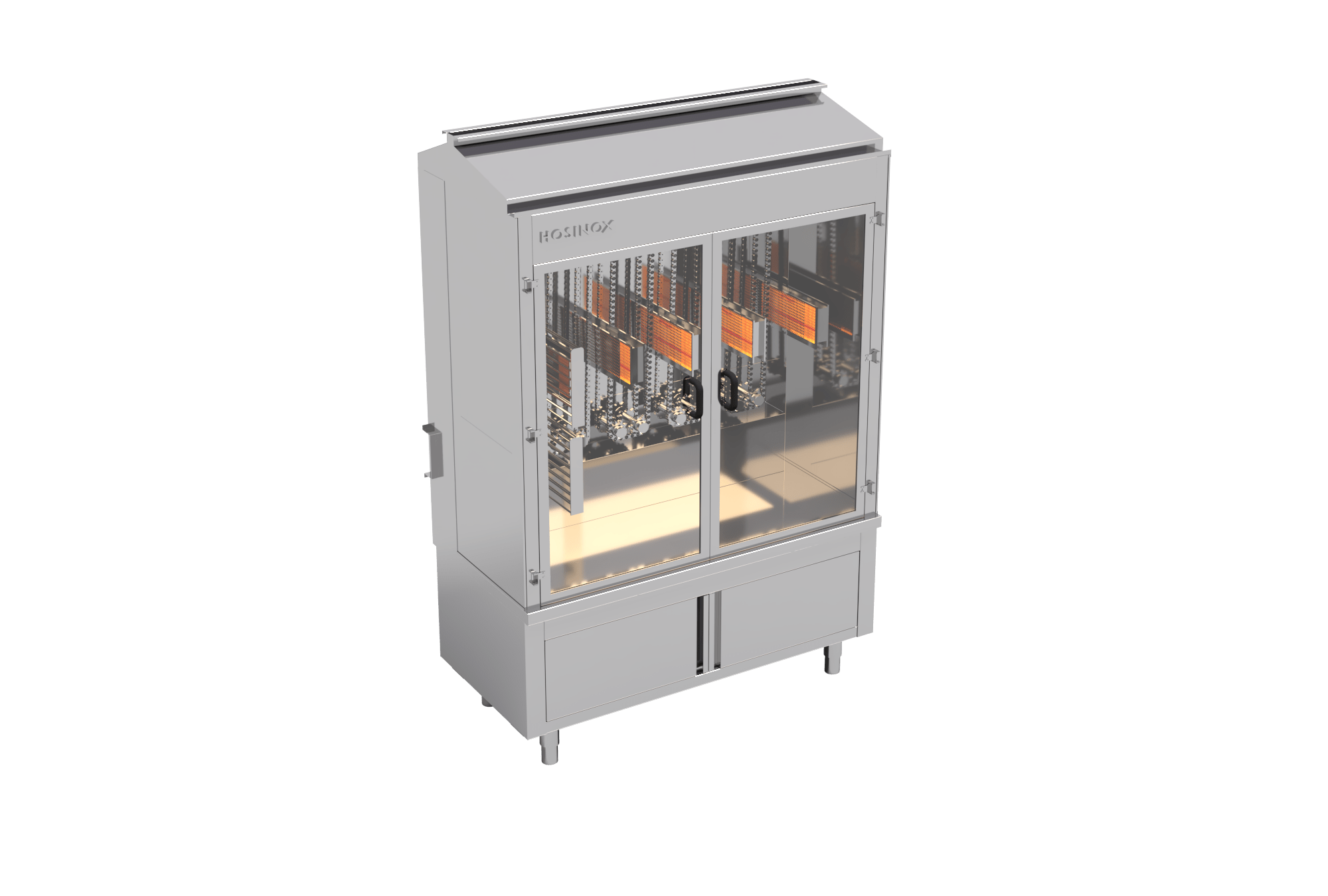 A chicken rotisserie grill is a professional cooking appliance designed to roast chickens by rotating them on spits or baskets inside a heated chamber. This rotation ensures even cooking, resulting in a crispy golden skin and juicy meat, making it ideal for restaurants, hotels.